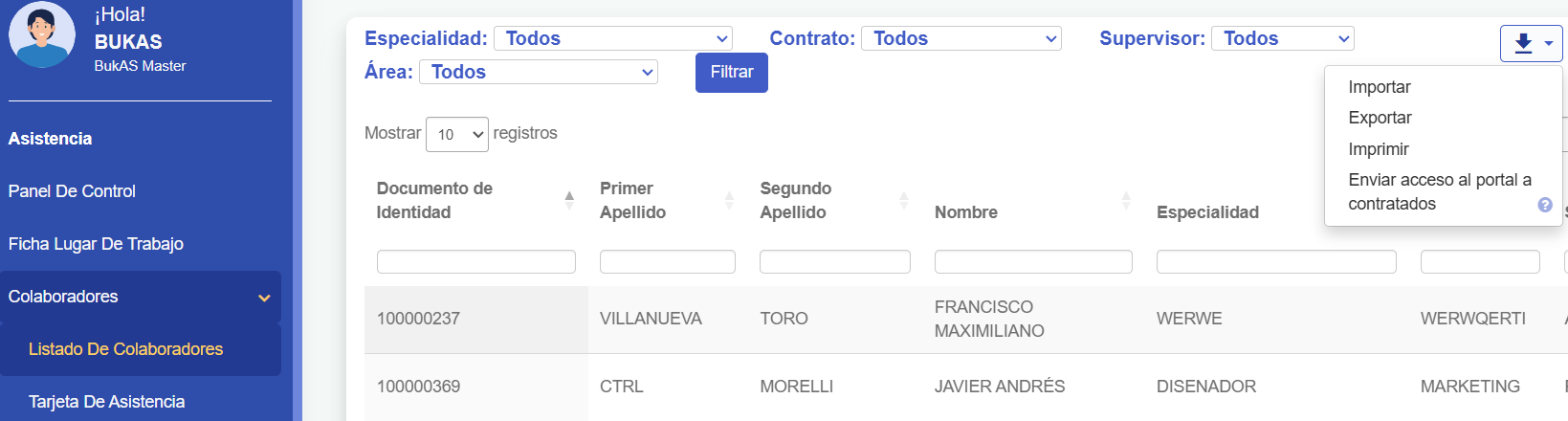 Ve a Colaboradores >> Listado de colaboradores. En el botón de descargas, selecciona "Exportar" para descargar la plantilla y completar los datos solicitados.