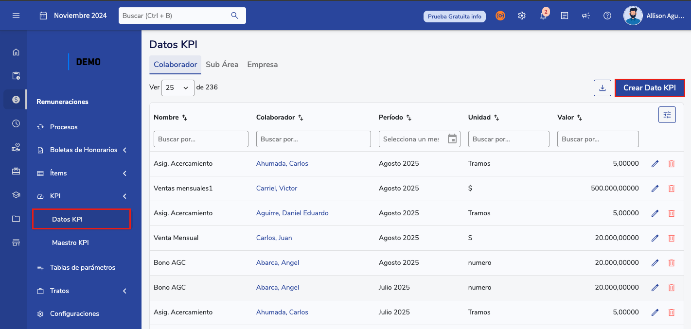 - Selecciona el KPI que deseas asignar (previamente creado) y elige el mes a partir del cual se aplicará el dato. Dependiendo de la relación establecida al crear el KPI, deberás especificar el empleado, empresa o área correspondiente, luego ingresa el valor del dato