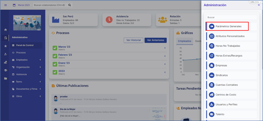 Si eres administrador de Buk y deseas revisar o modificar los parámetros generales de la plataforma, debes dirigirte a la Tuerca de Administración >> Parámetros Generales.
