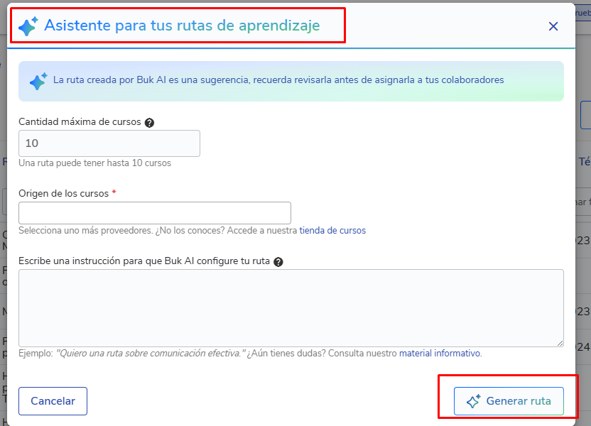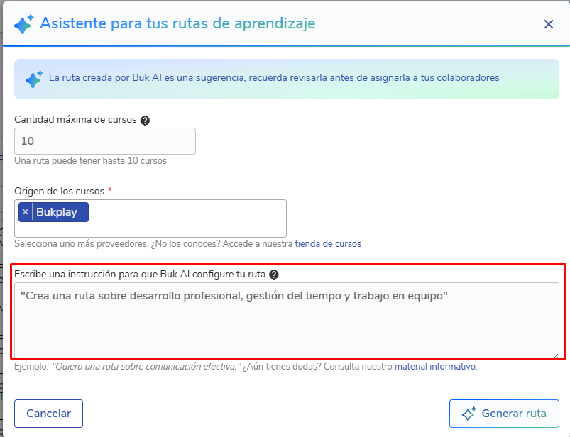 El propósito de este artículo es guiar a los usuarios en la creación de rutas de aprendizaje con Buk AI. Este asistente virtual con inteligencia artificial ayuda a crear rutas de aprendizaje de forma rápida, personalizada y alineada con las necesidades formativas de tu equipo. Con esta funcionalidad, podrás ahorrar tiempo y potenciar la estrategia de capacitación de tu organización, generando rutas relevantes según los objetivos de aprendizaje y competencias clave.