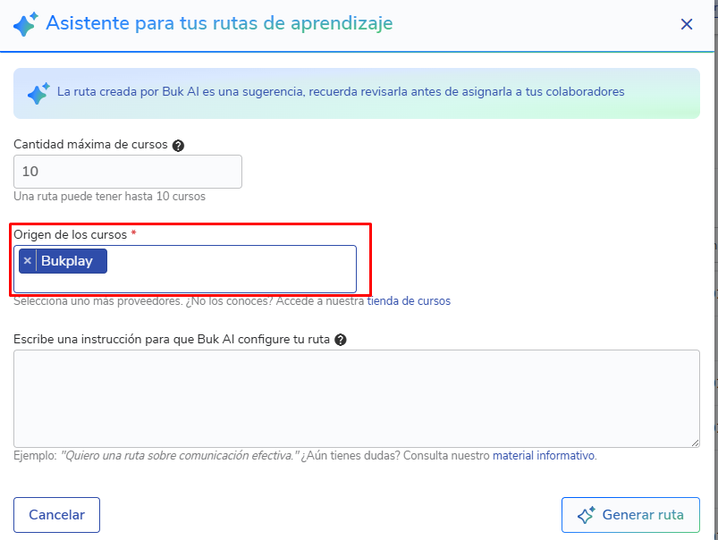3. Ingresa el número máximo de cursos que deseas que tenga la ruta. El máximo permitido por Buk AI es 10.