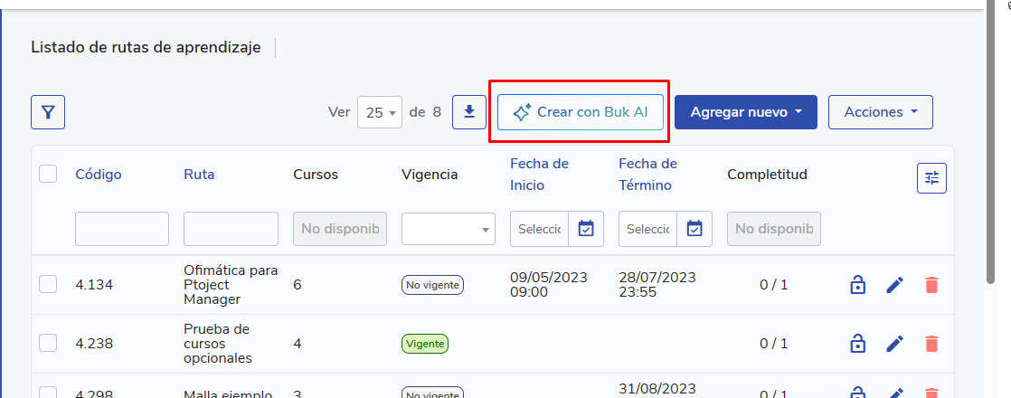 6. Luego, presiona el botón Buk Copilot generará automáticamente una propuesta de ruta de aprendizaje con una selección de cursos organizados por niveles o temas. ¡Ten paciencia! Este proceso puede demorar unos segundos.