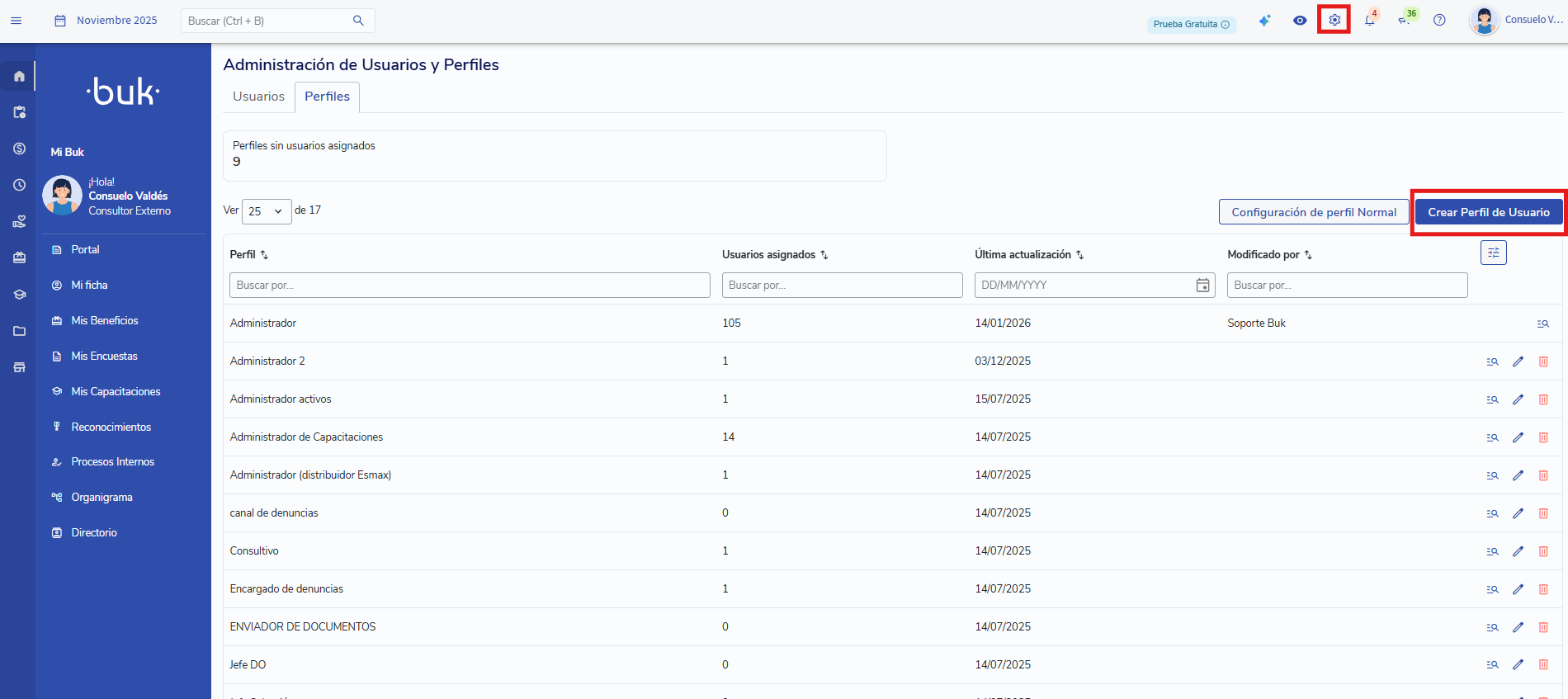 Ve a ⚙️ Administración > 👥 Usuarios y Perfiles > Pestaña Perfiles.