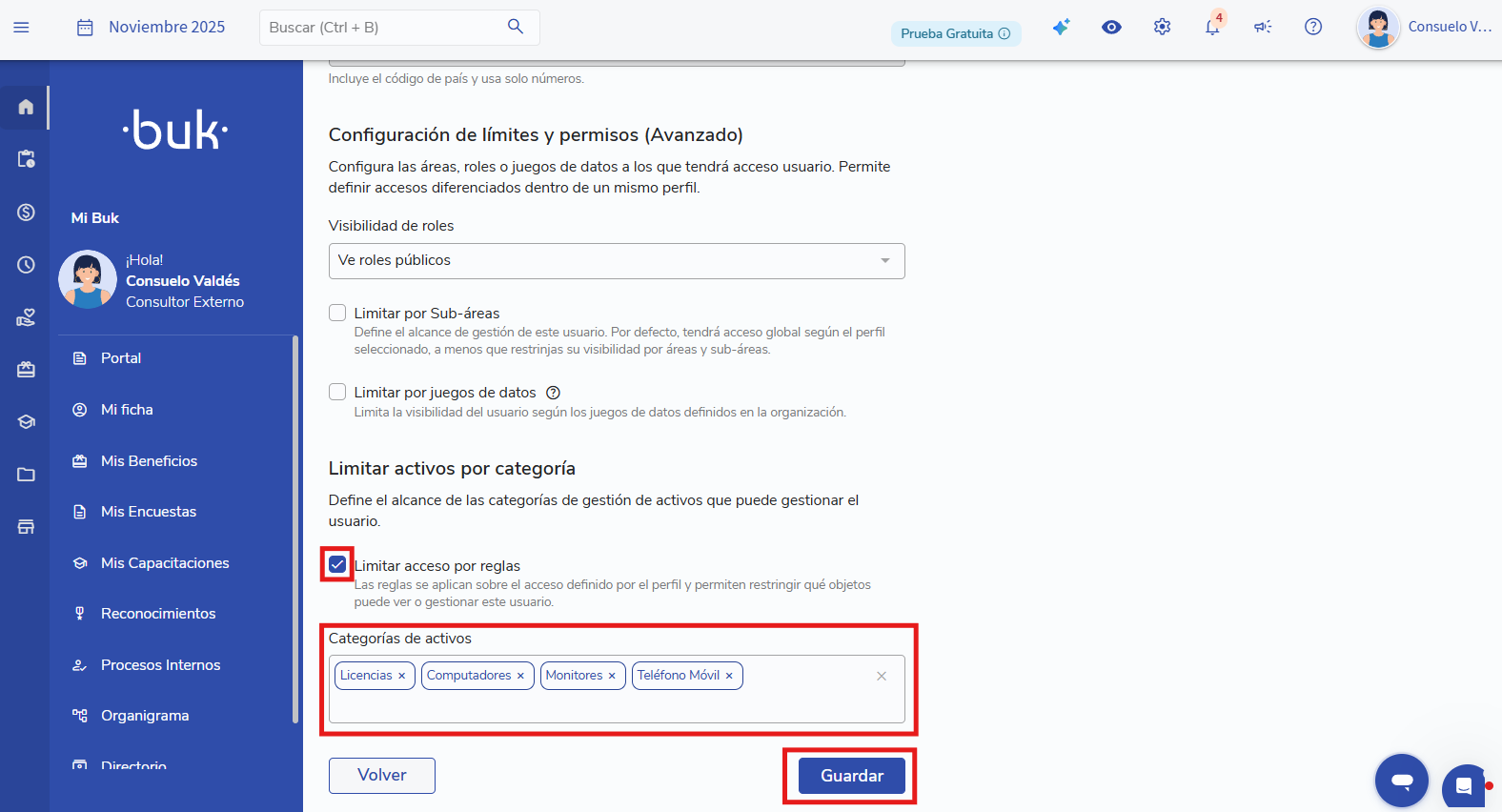 En el formulario desplegado verás al final la sección de "Limitar activos por categoría". Dentro, debes activar el checkbok de "Limitar acceso por reglas" y posteriormente seleccionar las categorías de activos por las cuales deseas limitar al usuario en cuestión.