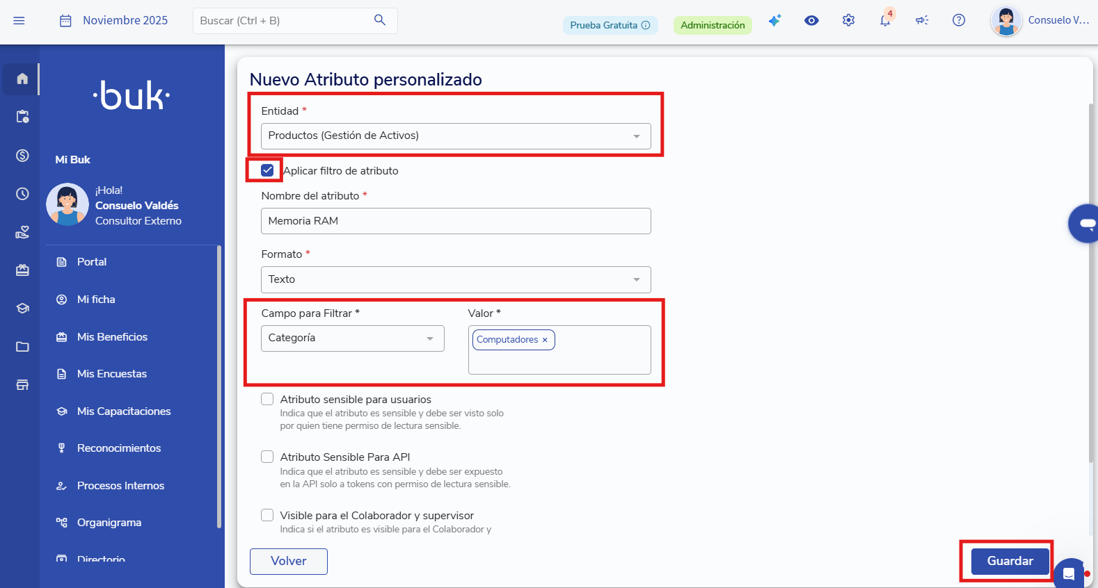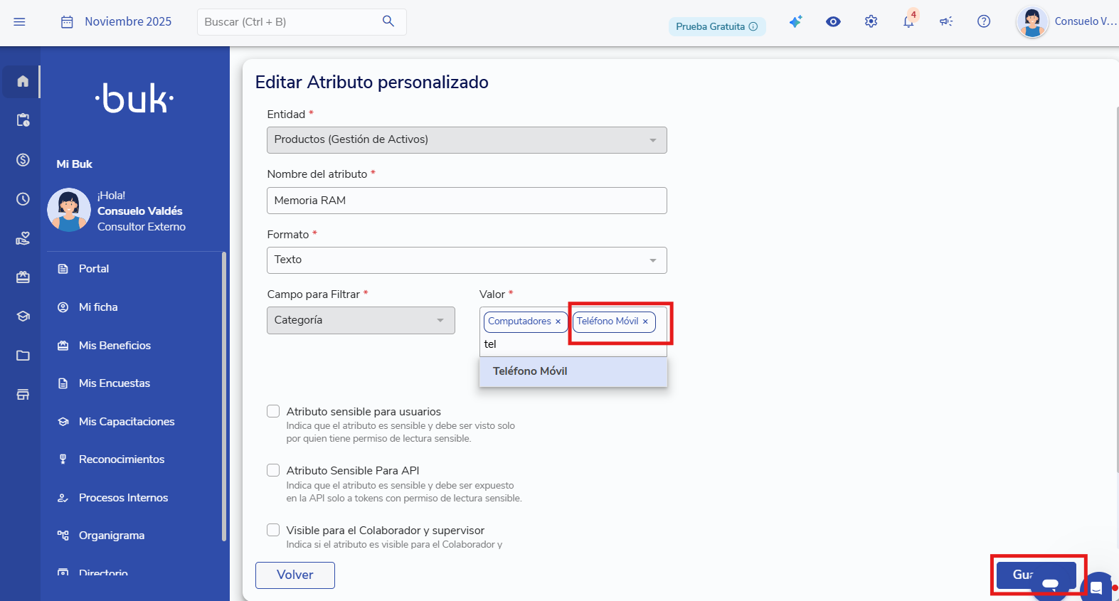 Agrega la nueva categoría donde quieras que aparezca ese atributo y haz clic en guardar.