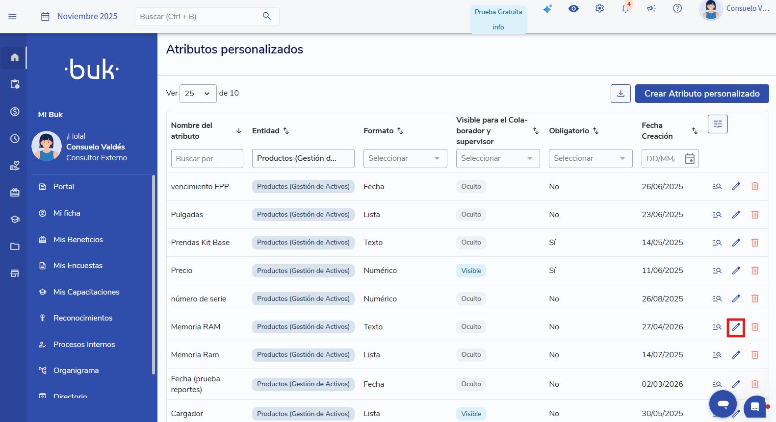 En el listado de atributos personalizados, haz clic en el lápiz del atributo a editar