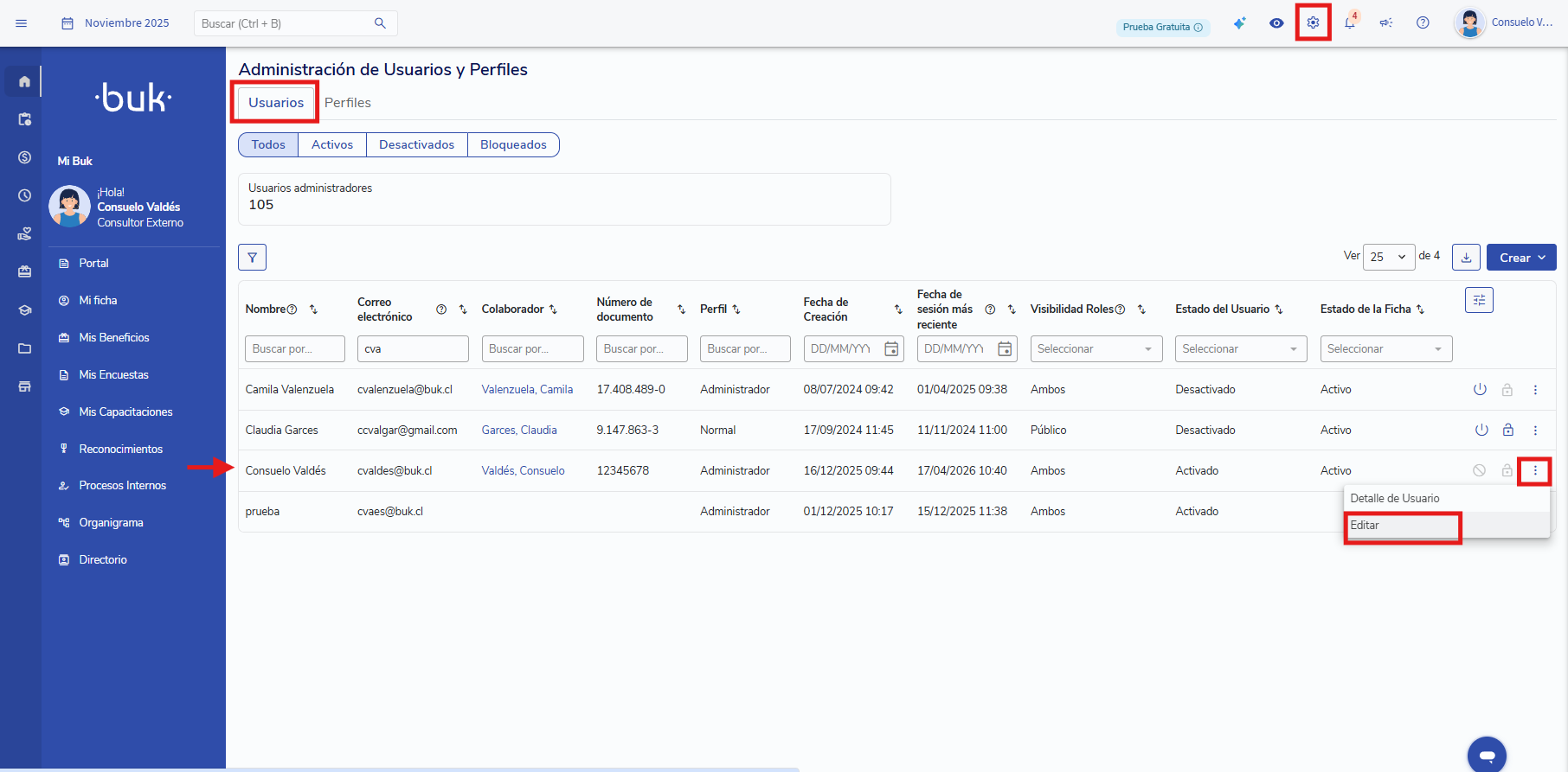Perfil de usuario con permisos de edición en el módulo de Administración.