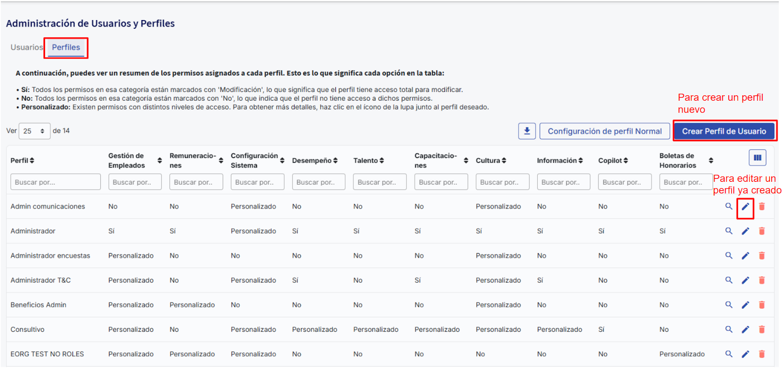 Al ingresar a esta sección podrás editar un perfil ya creado o crear uno nuevo.