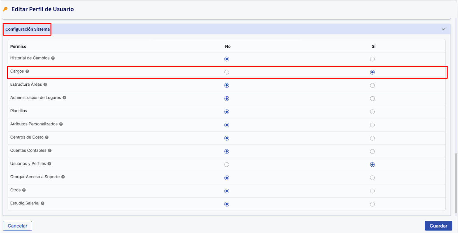 - Permisos sobre Cargos: Busca la sección “Configuración Sistema” y marca “Si” para la categoría Cargos
