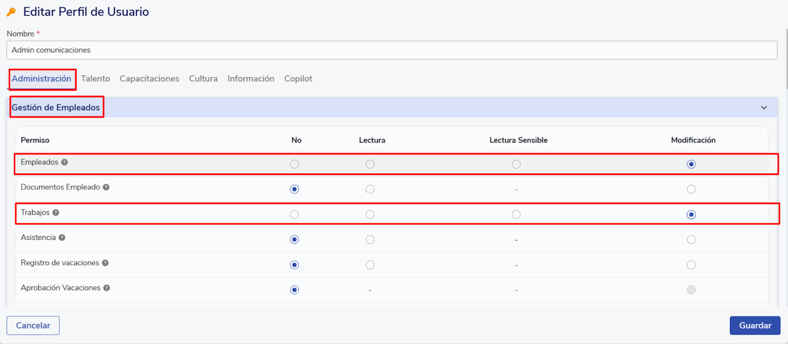 - Permisos de Modificación sobre Empleados: Busca la sección “Gestión de empleados” y selecciona Modificación para la categoría Empleados.