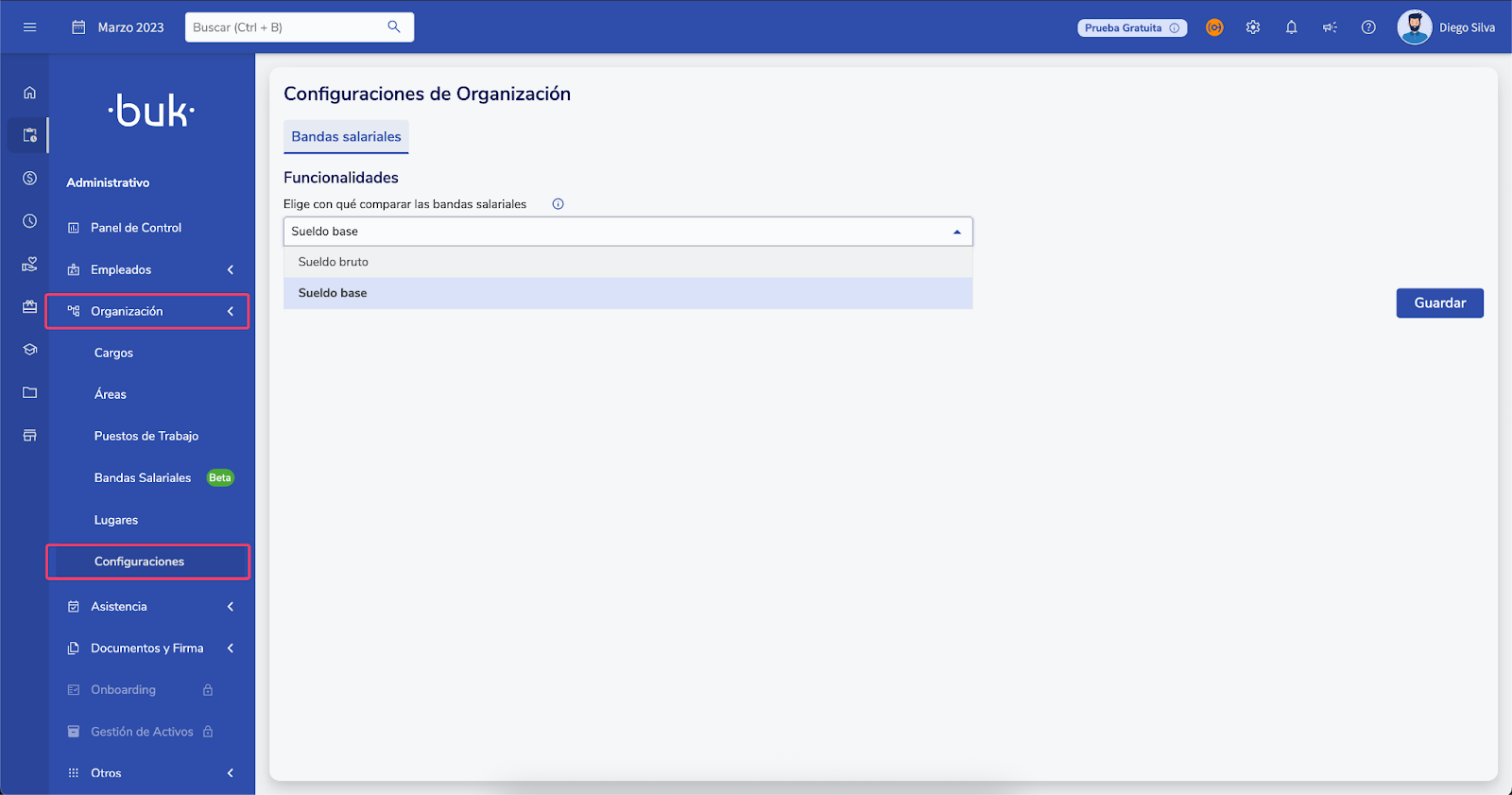 Para comenzar, ingresa a Organización → Configuraciones y selecciona el tipo de sueldo que utilizarás para realizar la comparación y análisis de bandas salariales. Tienes dos opciones: