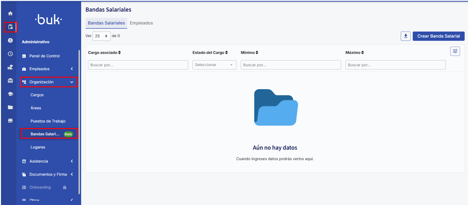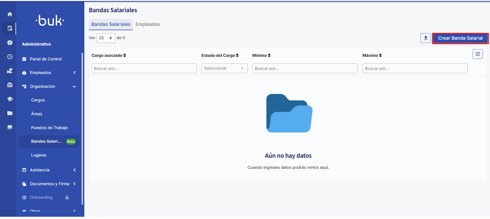 Si tu usuario ya cuenta con los permisos necesarios y quieres crear bandas salariales debes ingresar a Administrativo → Organización → Bandas Salariales. Aquí encontrás la nueva sección de bandas salariales. En esta tabla encontrarás las bandas salariales creadas, por lo que en un inicio, estará vacía.