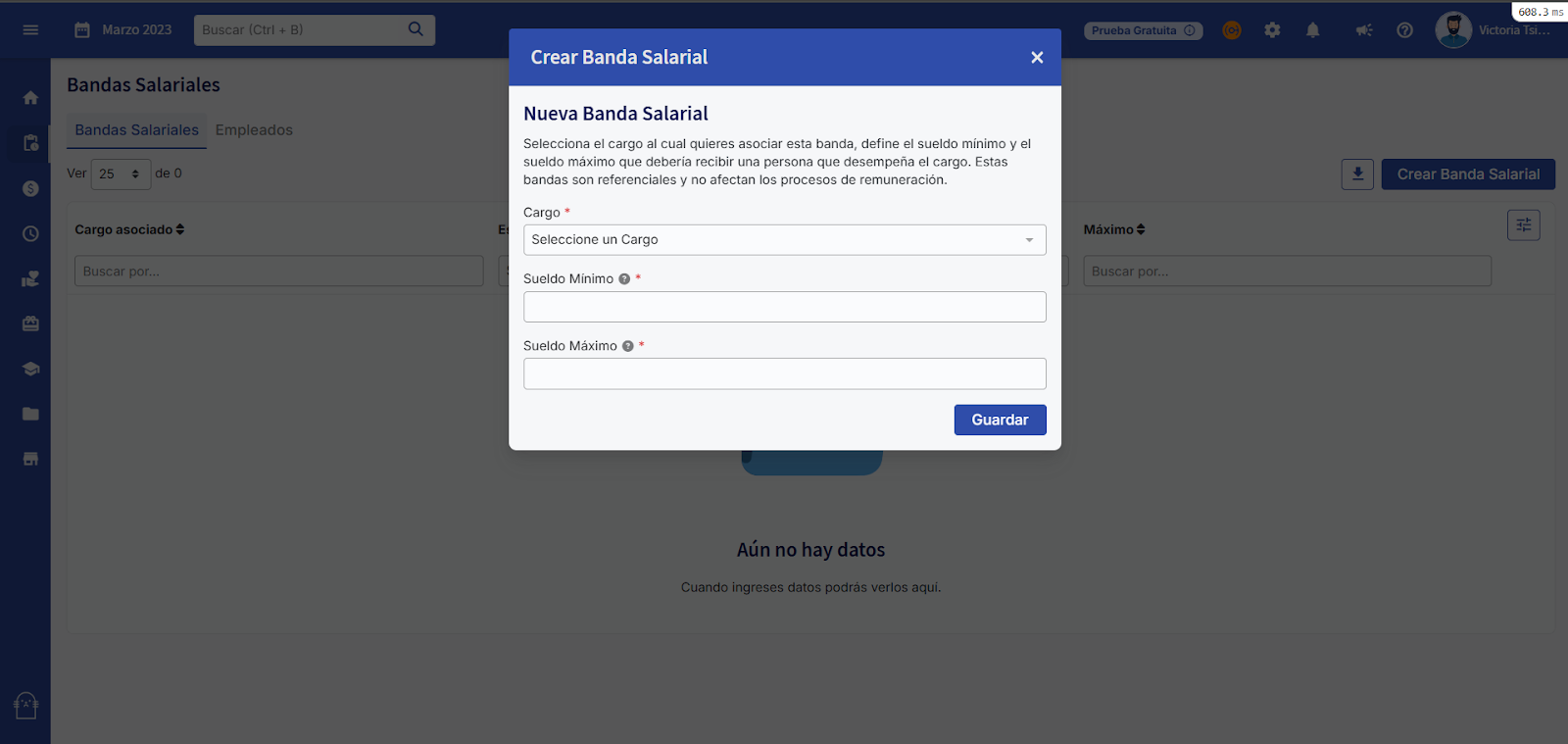 Para crear una nueva banda salarial aprieta el botón “Crear banda salarial”, con esto se abrirá el modal donde podrás ingresar tu nueva banda salarial.