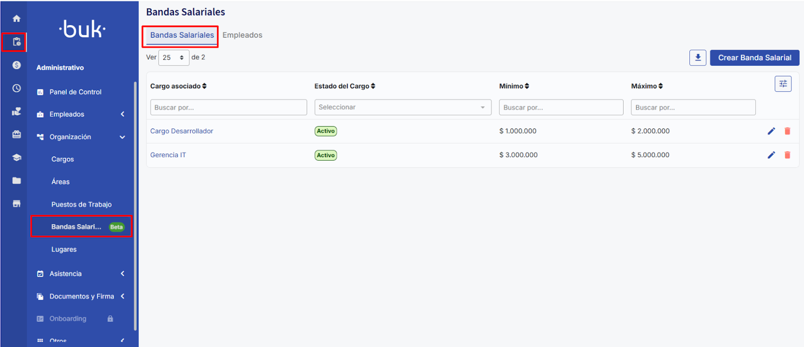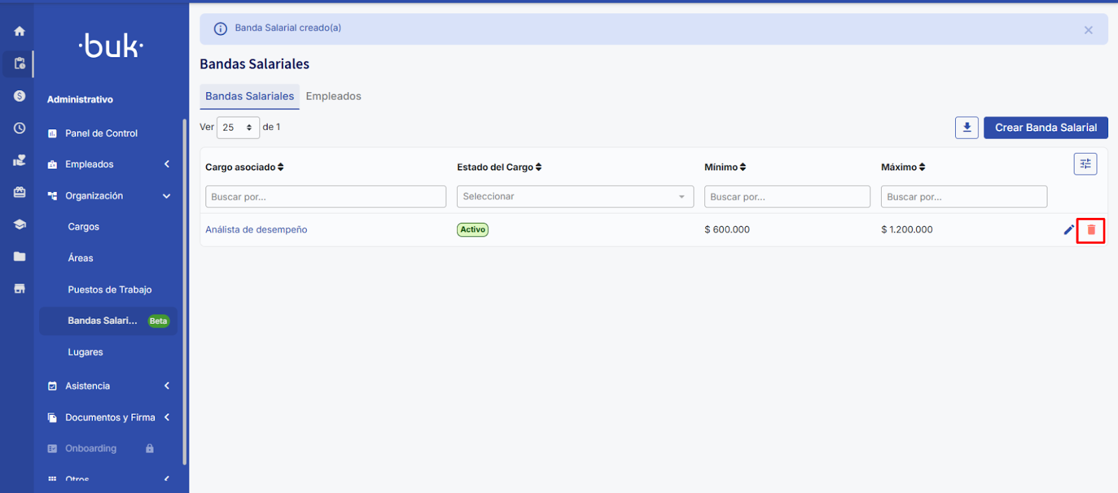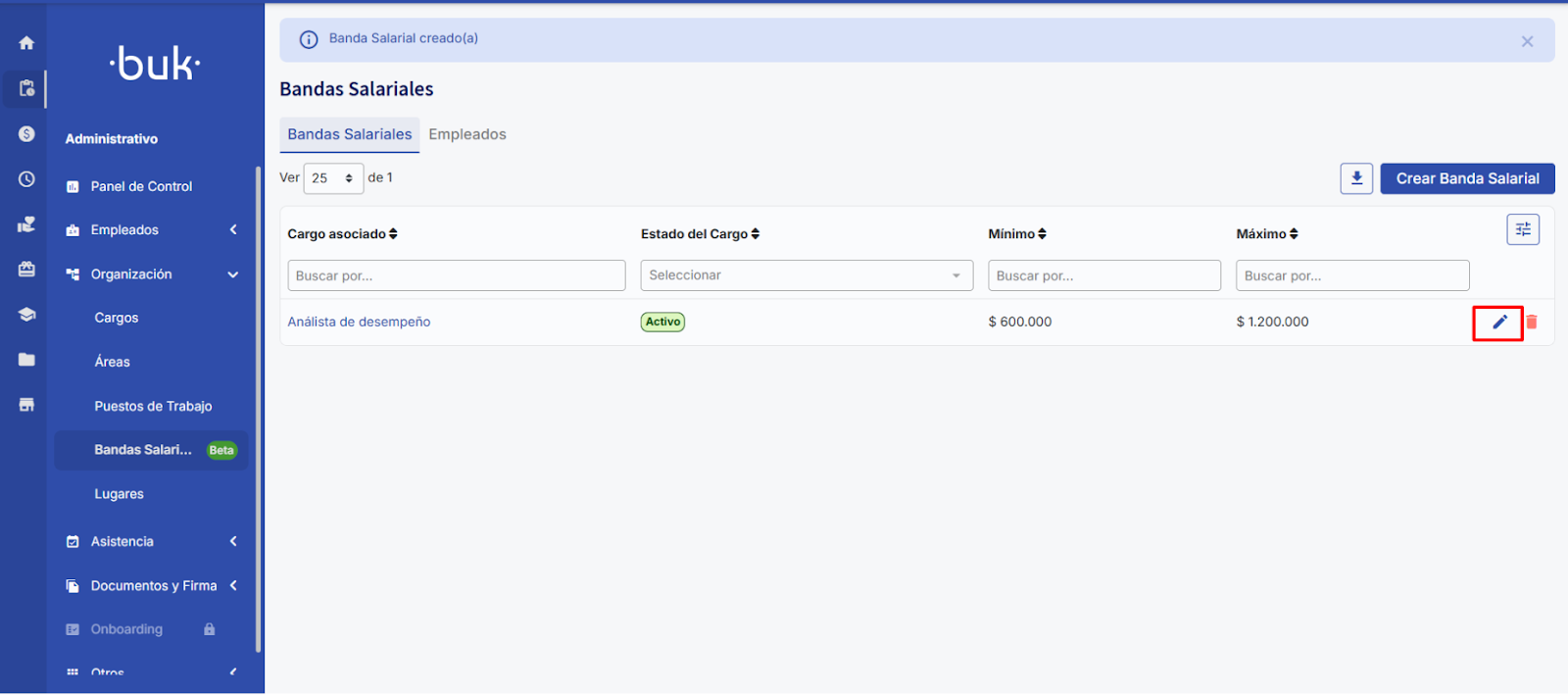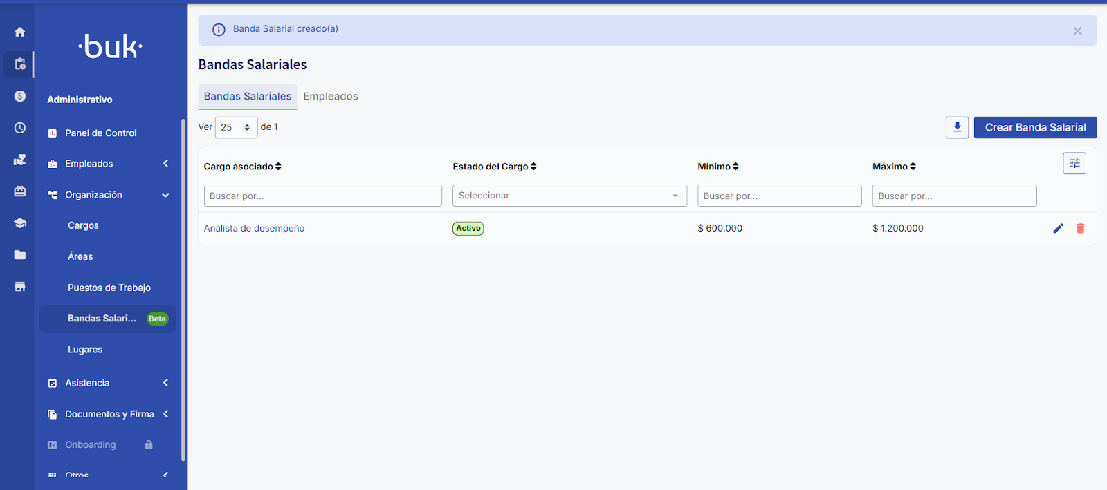 Al presionar “Guardar” tu banda salarial quedará guardada y visible en la tabla. En esta tabla podrás buscar por cargo, filtrar por el estado del cargo al que está asociada la banda y buscar por mínimo o máximo.