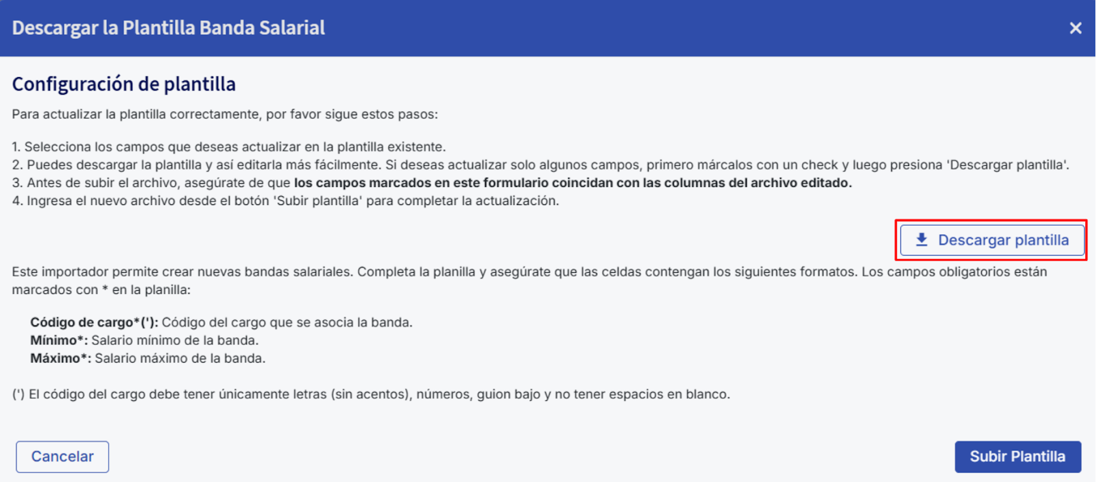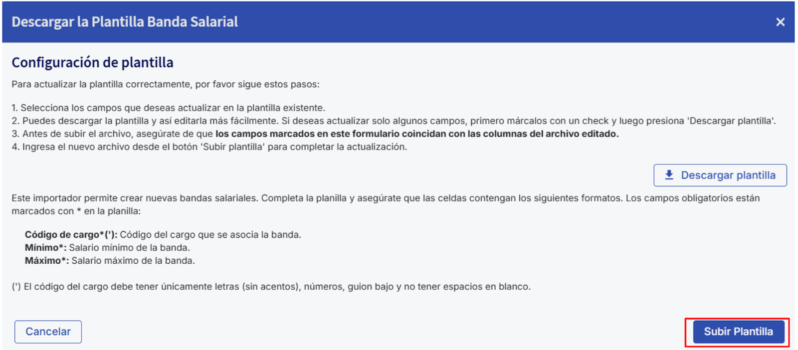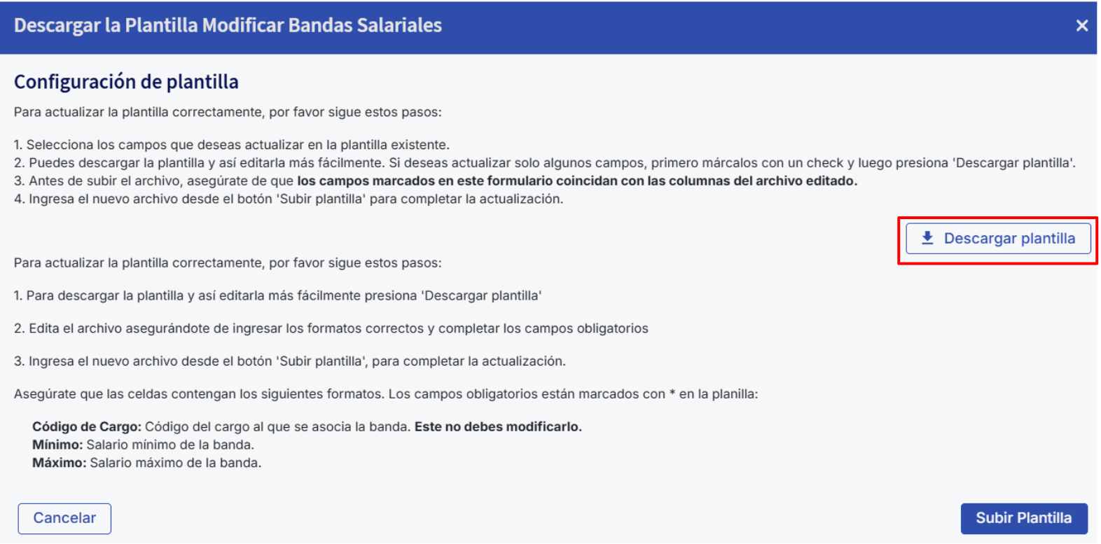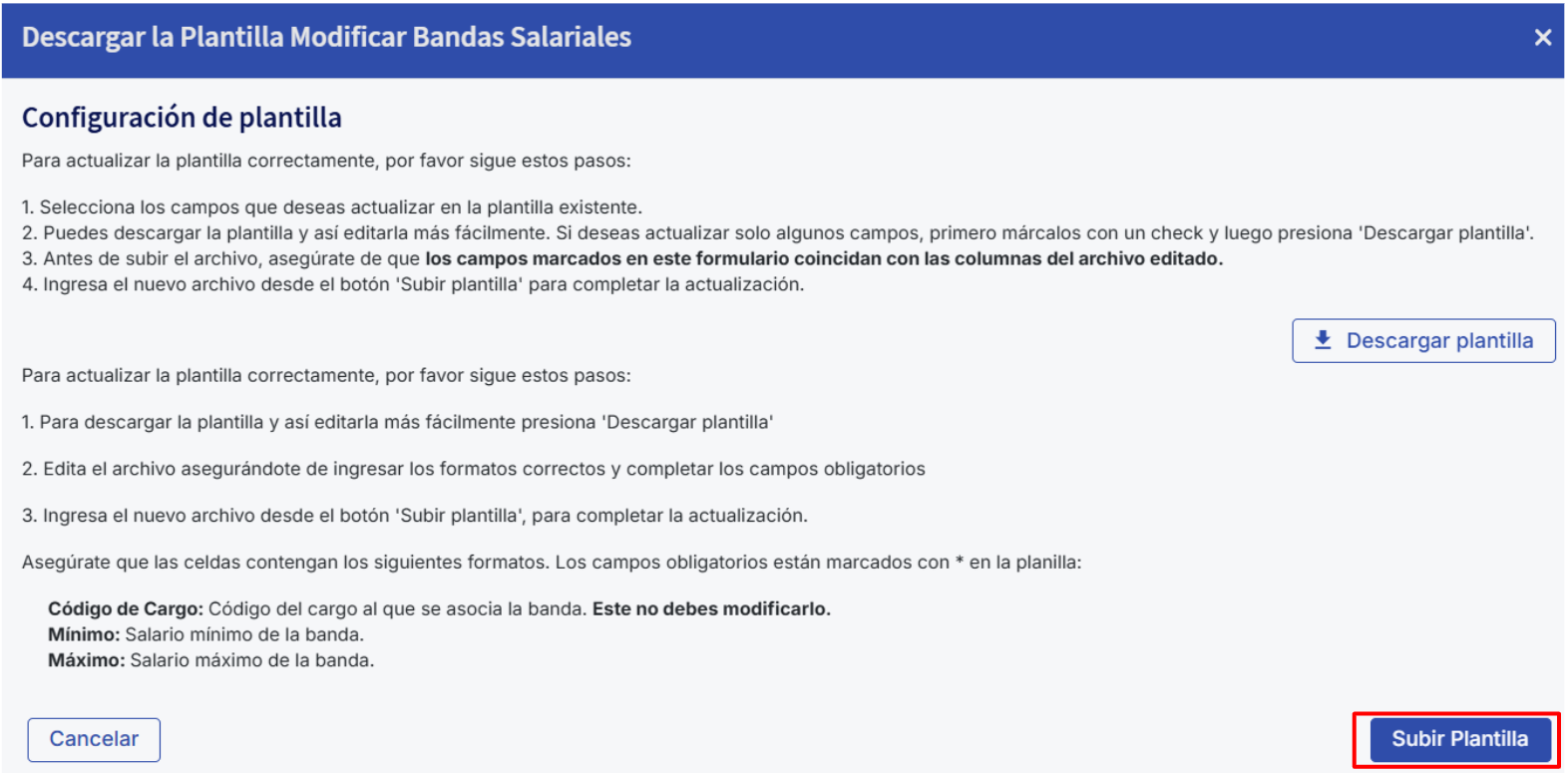 Una vez completada la hoja de Bandas Salariales, vuelve a la plataforma y haz clic en "Subir Plantilla" para cargar el archivo Excel y completar el proceso de importación.
