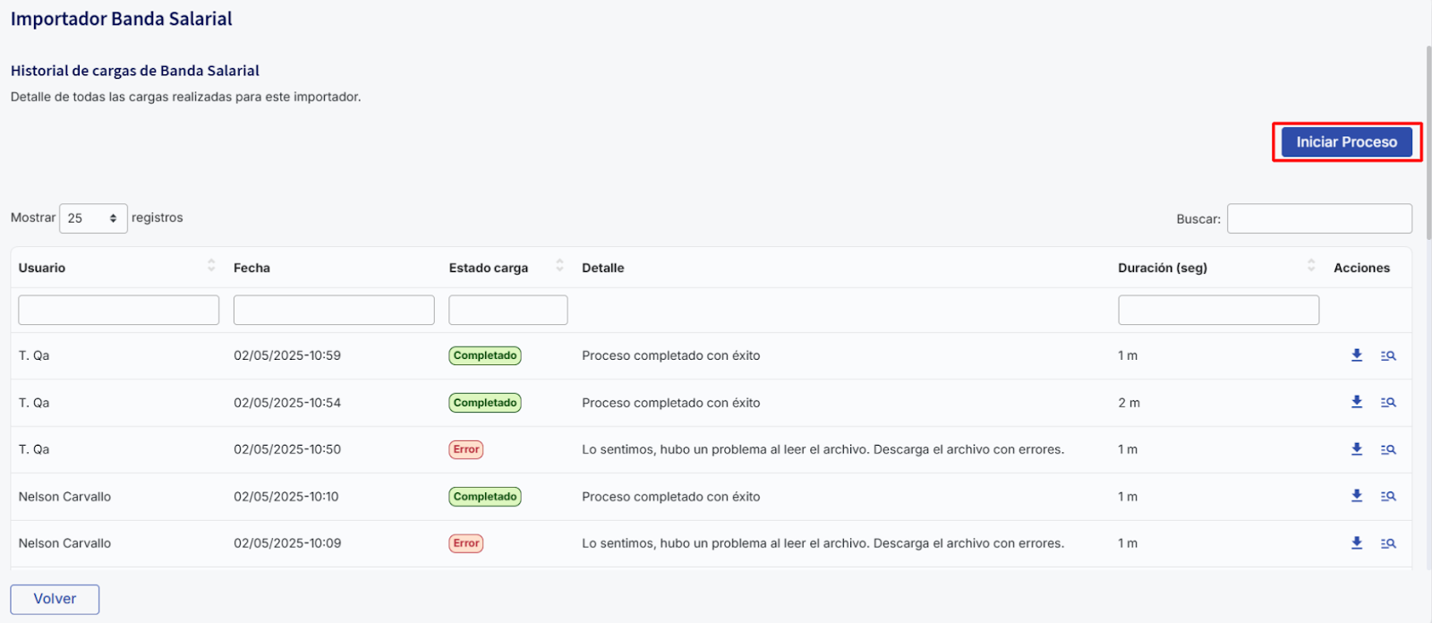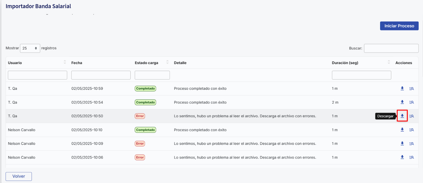 Para revisar los errores, simplemente haz clic en el botón de descarga correspondiente a la carga que deseas examinar.