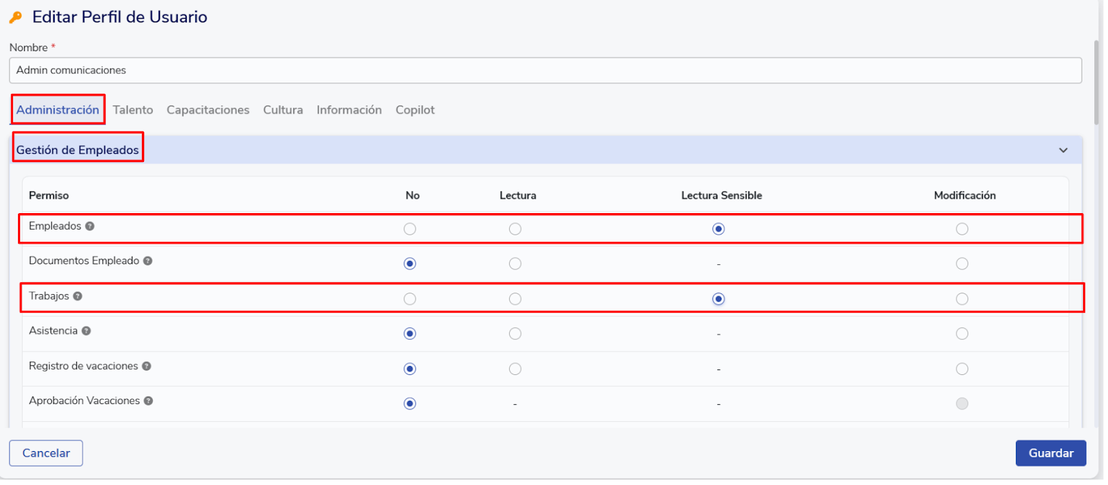 - Permisos de Lectura Sensible sobre Emplados: Busca la sección “Gestión de empleados” y selecciona Lectura Sensible para la categoría Empleados