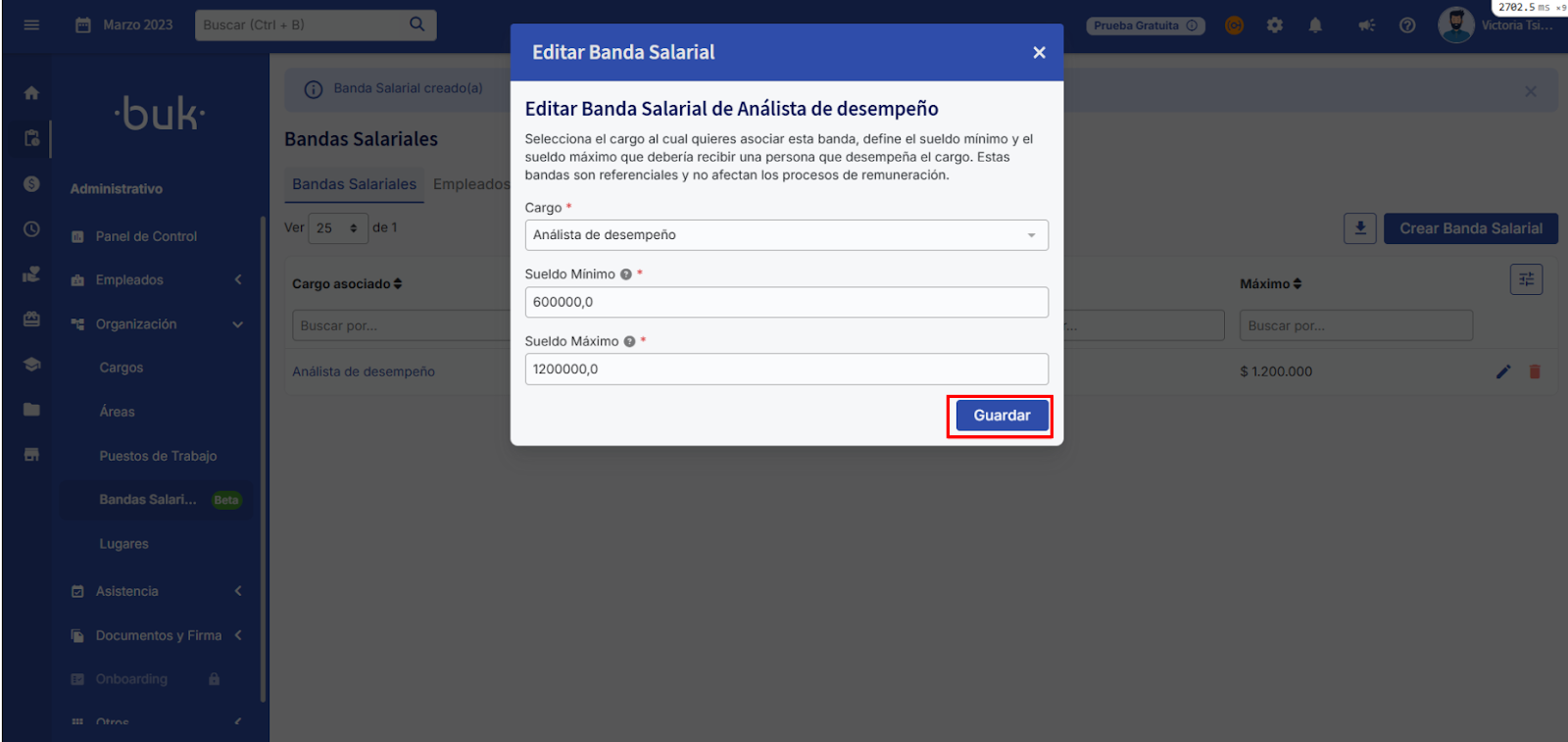 - Máximo: ingresa el monto máximo de la banda salarial para ese cargo.