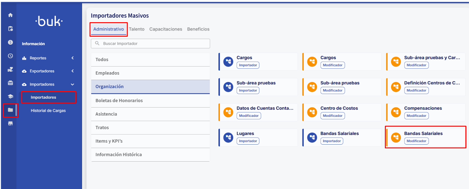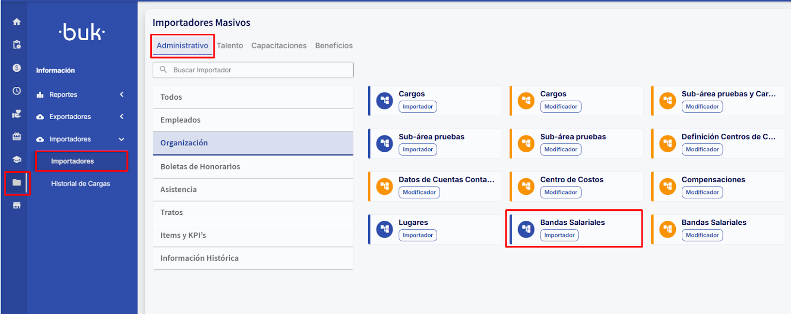 Para llegar al modificador de bandas salariales dirígete al módulo "Información", selecciona la sección "Importadores" y luego nuevamente en "Importadores". Dentro de las categorías disponibles, elige "Administrativo" → “Organización” y ahí encontrarás el modificador de Bandas Salariales.