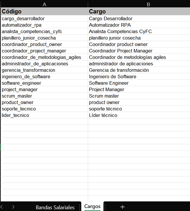 Debes copiar desde aquí los códigos de los cargos a los que deseas asignar bandas salariales, y pegarlos en la columna "Código de cargo" de la Hoja 1.