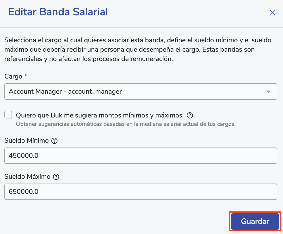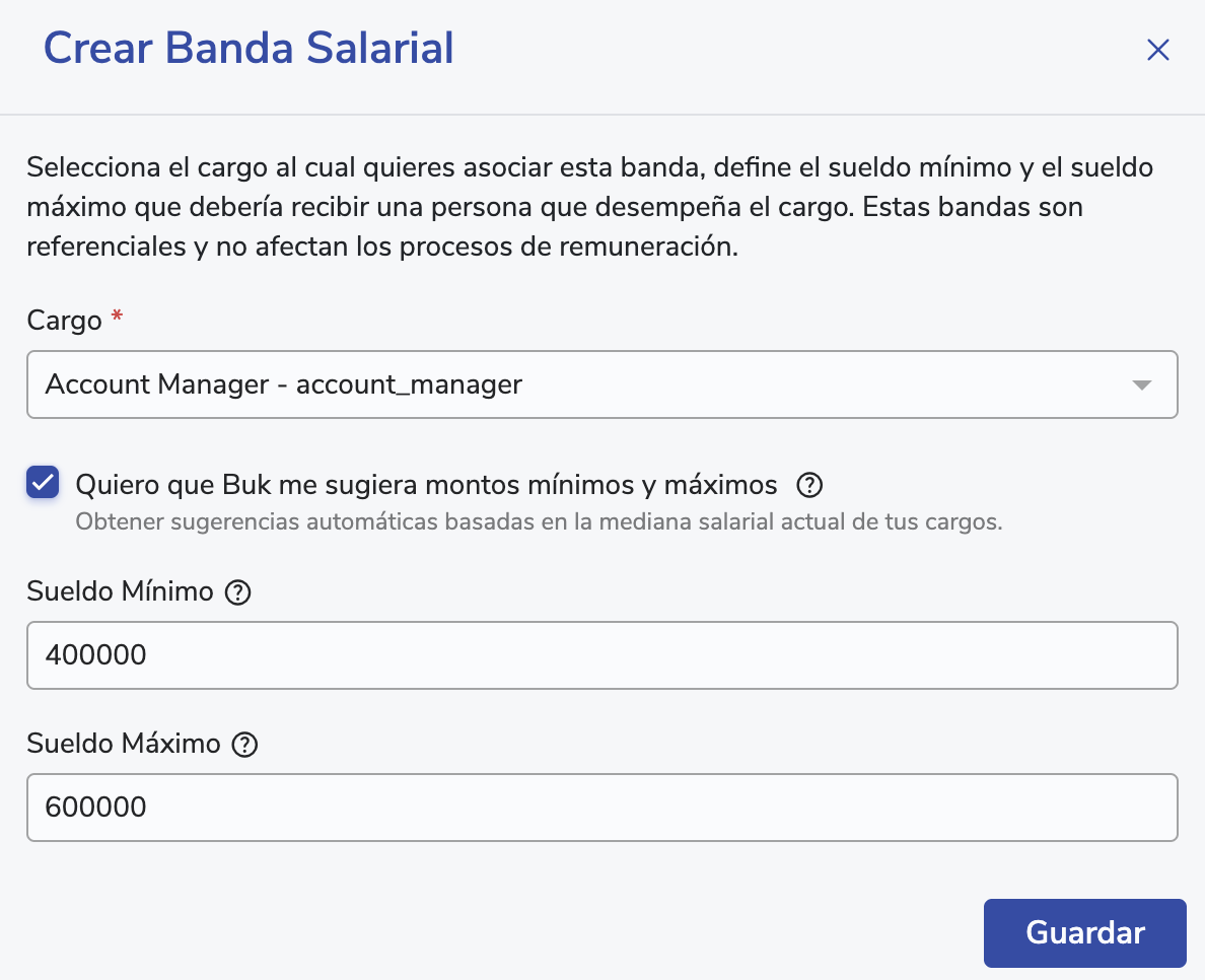 Si no tienes los valores de las bandas definidos, nosotros de ayudamos a crearla con un definición estándar. Al seleccionar "Quiero que Buk me sugiera montos mínimos y máximos", tomamos los valores de sueldo base de tus colaboradores que tengan el cargo seleccionado y calculamos la mediana. Luego, a la mediana, le sumamos y restamos un 20% y obtenemos los límites de banda.