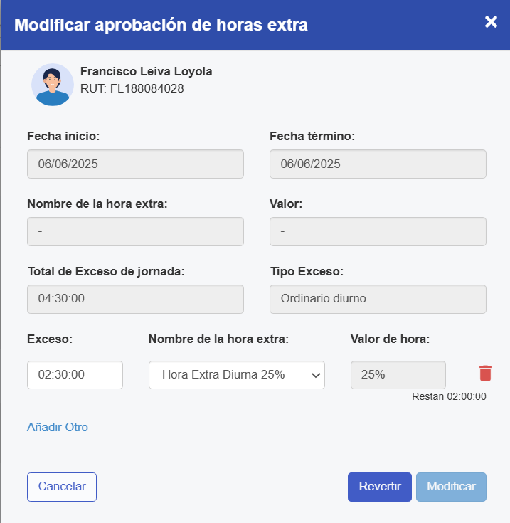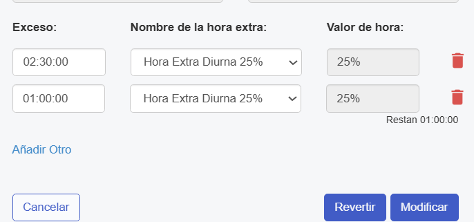 En caso de querer aprobar a dos tipos de horas extras diferentes, debes seleccionar "Añadir Otro", desplegando otra fila para aprobar al tipo de hora extra que necesites.