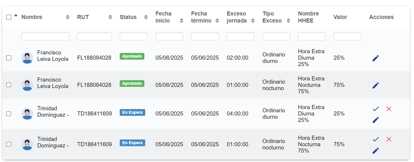 Luego de filtrar verás un listado de colaboradores con excesos de jornadas, de acuerdo a lo configurado en: configuraciones de horas extra.
