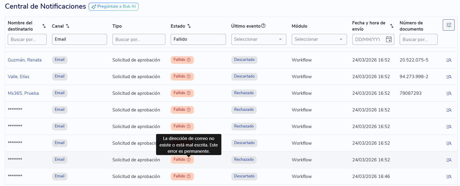 Si el estado es Fallido, al pasar el cursor sobre el estado podrás ver el motivo del error.