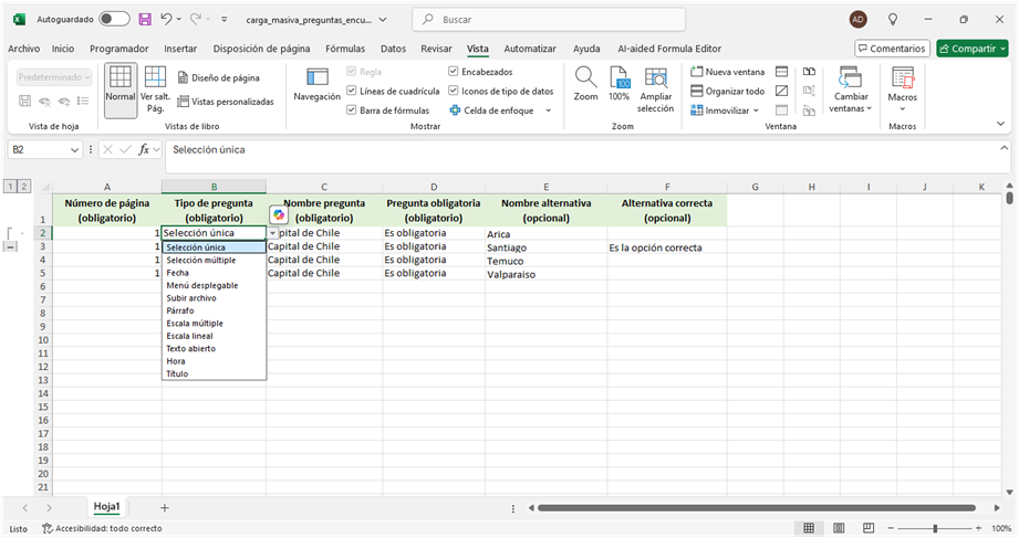 - Selección múltiple: Permite seleccionar múltiples opciones como respuesta.