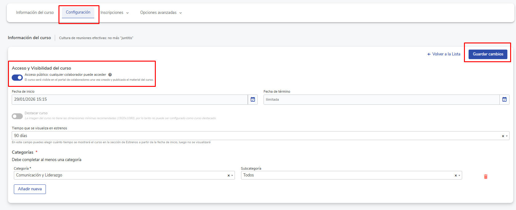 Luego activa el boton de Acceso y Visibilidad del curso