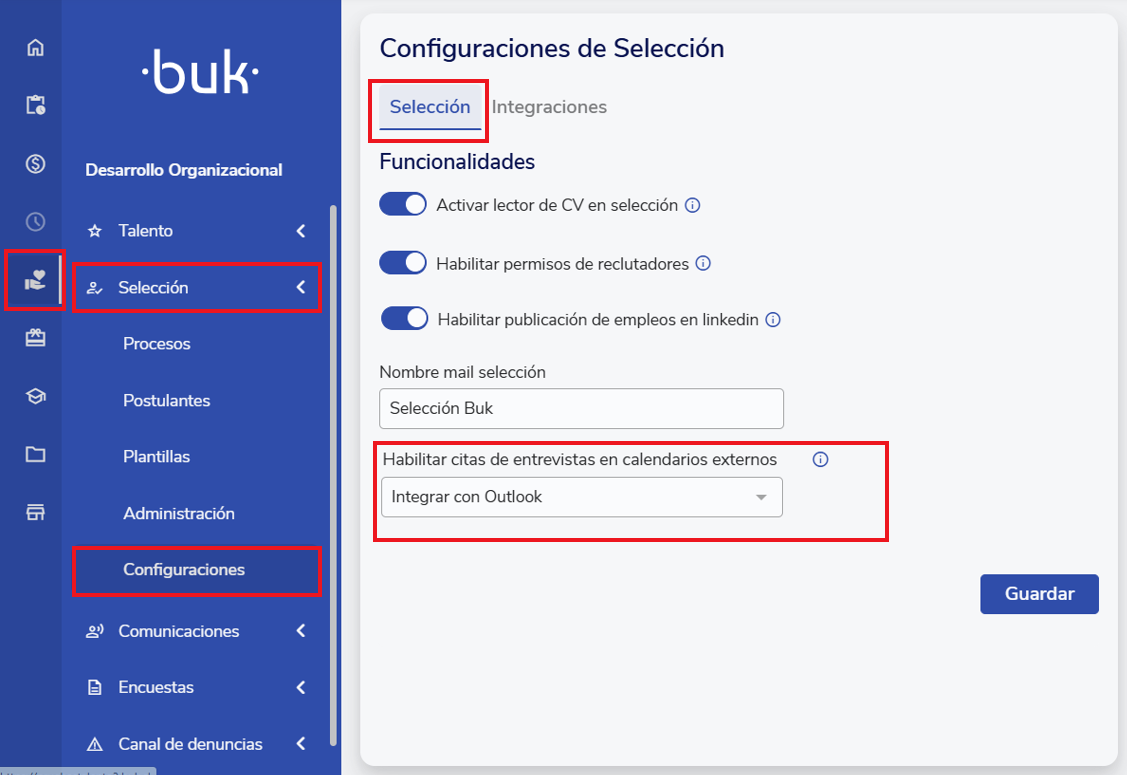 Primero, para poder agendar entrevistas con los postulantes en tu calendario de Outlook debes tener activada la configuración "Habilitar citas de entrevistas en calendarios externos". Para esto debes ir a Selección, luego a Configuraciones y habilitar la opción "Integrar con Outlook".