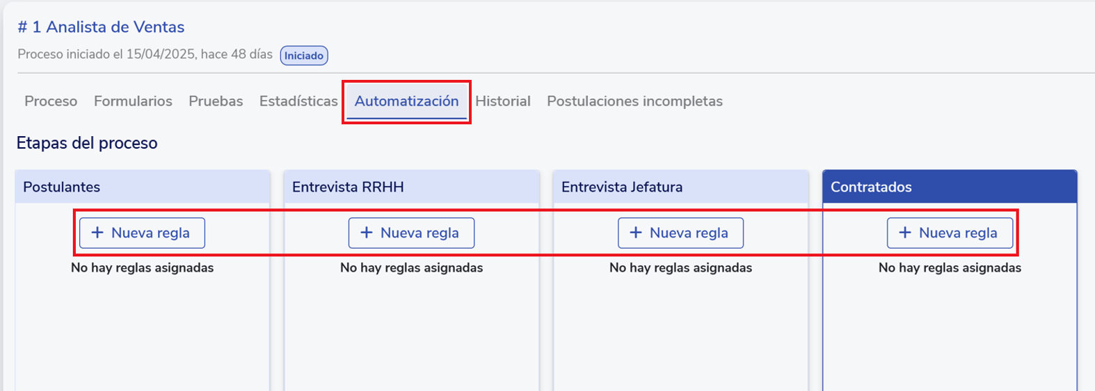 Para automatizar el envío de pruebas, entra al proceso de selección y ve a la pestaña “Automatización”. Selecciona la etapa correspondiente y haz clic en “+ Nueva regla”.