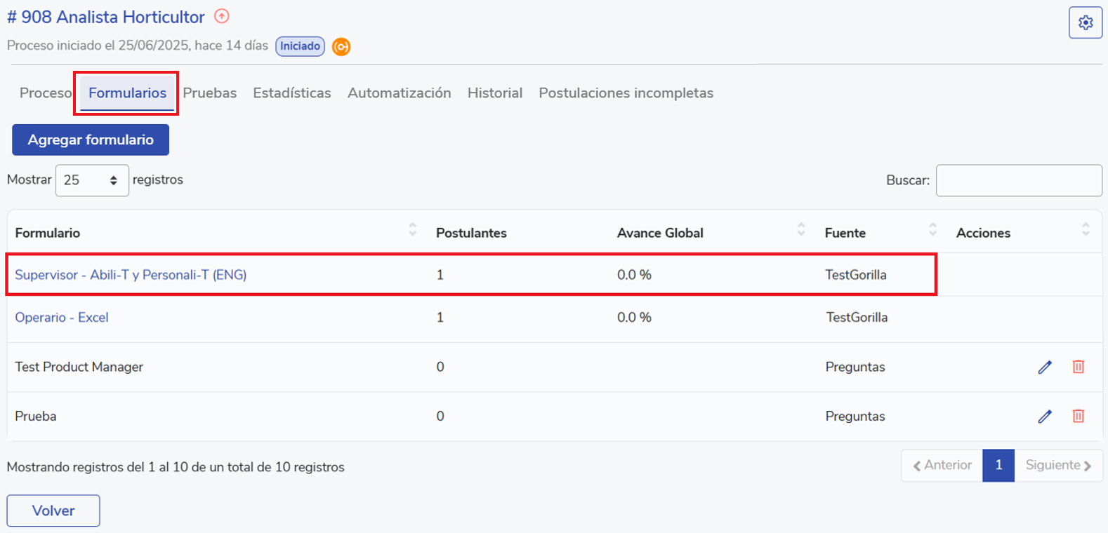 Dentro del proceso de selección en el cual se envió la prueba, en el tab “Formularios”, se mostrarán las pruebas psicométricas de las cuales el cliente dispone. Se podrá visualizar: