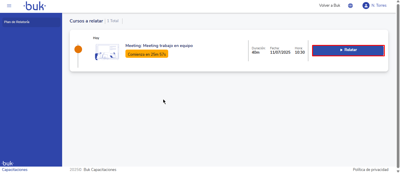 💡 Importante: El botón “Relatar” estará disponible únicamente en el día y horario configurado para la sesión.