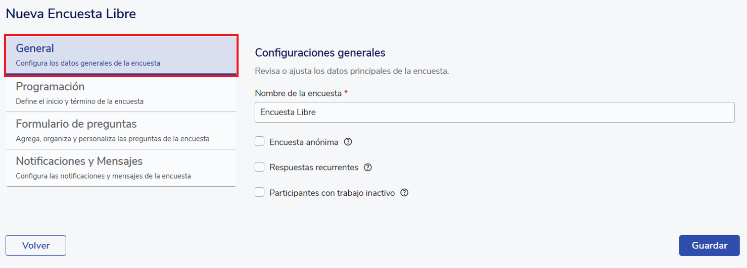 Para habilitar esta encuesta para colaboradores con ficha inactiva, debes marcar el checkbox “Participantes con trabajo inactivo” en la primera sección de General. No olvides hacer clic en “Guardar” para continuar.