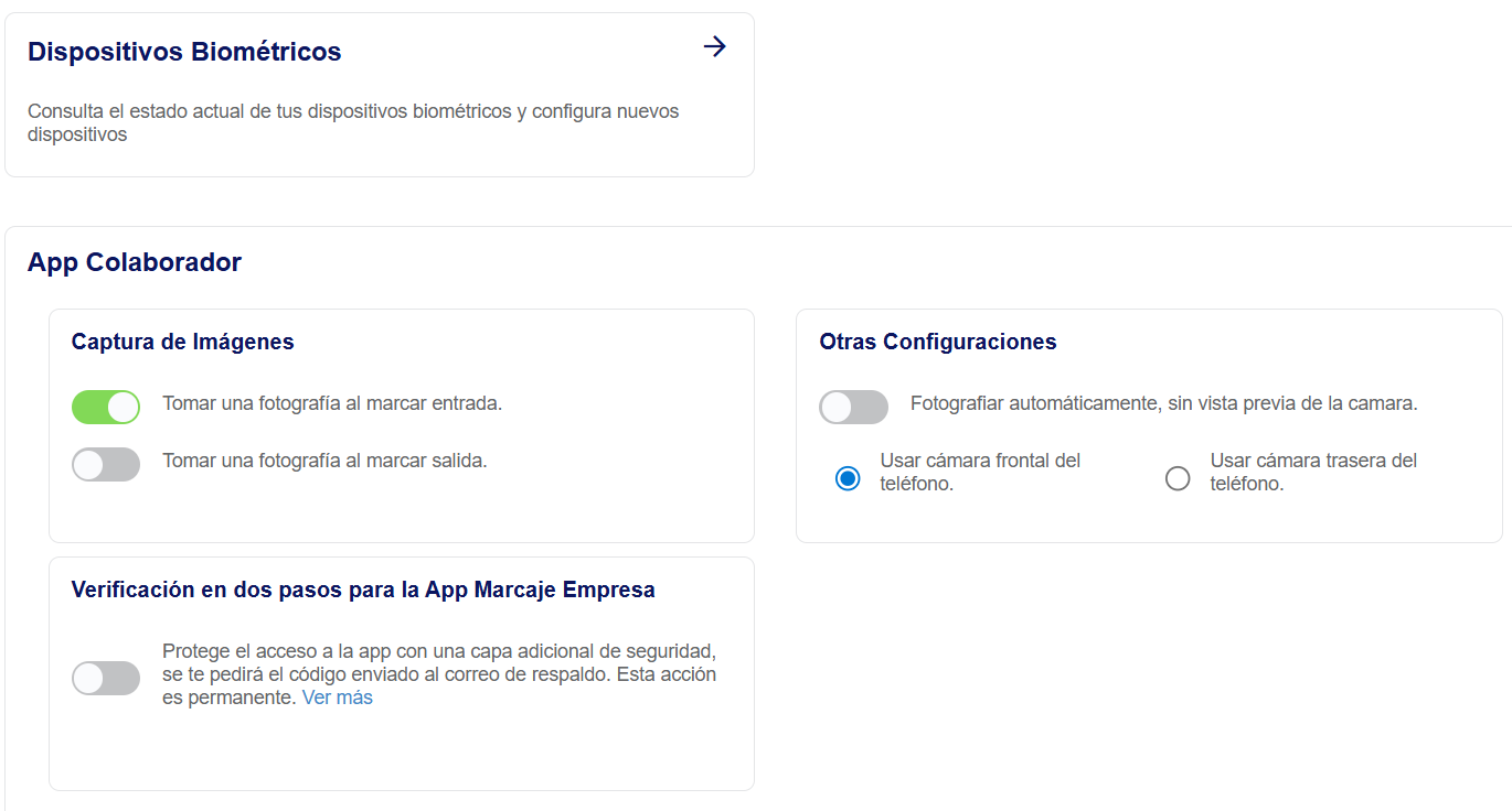 En la pantalla de Dispositivos de Marcaje encuentras las sección App Colaborador, donde podrás activar o desactivar opciones de configuración.