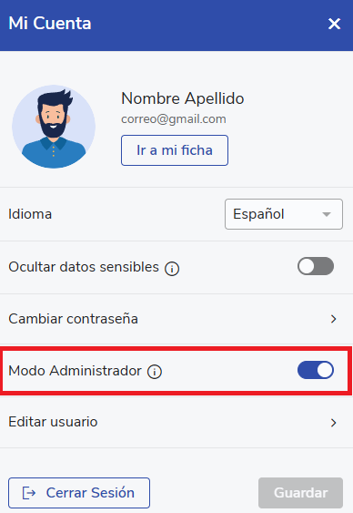 La opción Modo administrador aparece en la esquina superior derecha de tu cuenta y solo está visible si tienes perfil de administrador. Permite acceder a funcionalidades exclusivas de un Administrador, como la edición de variables mensuales.