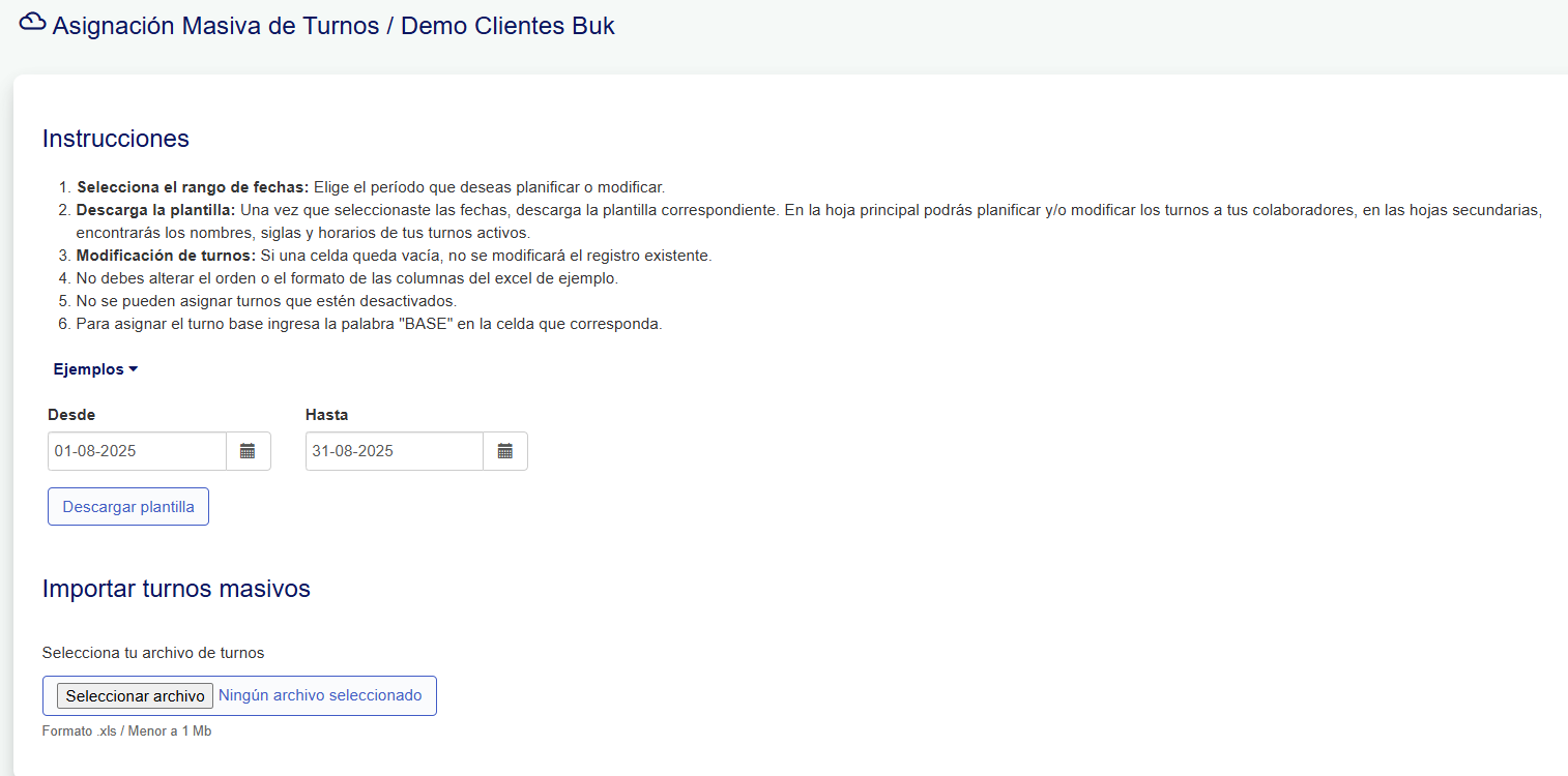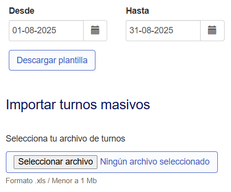 A continuación en la pantalla "Asignación masiva de turnos", selecciona las fechas necesarias y presiona el botón "Descargar Plantilla".