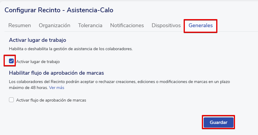 Se abrirá una nueva ventana. Dirígete a la pestaña Generales, desmarca la opción “Activar lugar de trabajo” y luego haz clic en Guardar para registrar los cambios.
