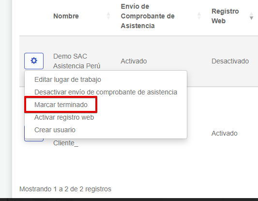 En la lista de lugares de trabajo, selecciona el botón de configuración que está al lado izquierdo del lugar de trabajo que deseas terminar. Luego dale click "Marcar terminado".