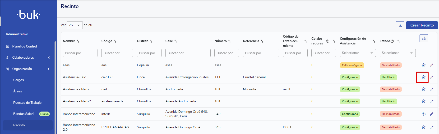 Se mostrará el listado de los recintos creados en la plataforma. Luego, haz clic en el ícono de tuerca del recinto que deseas finalizar.