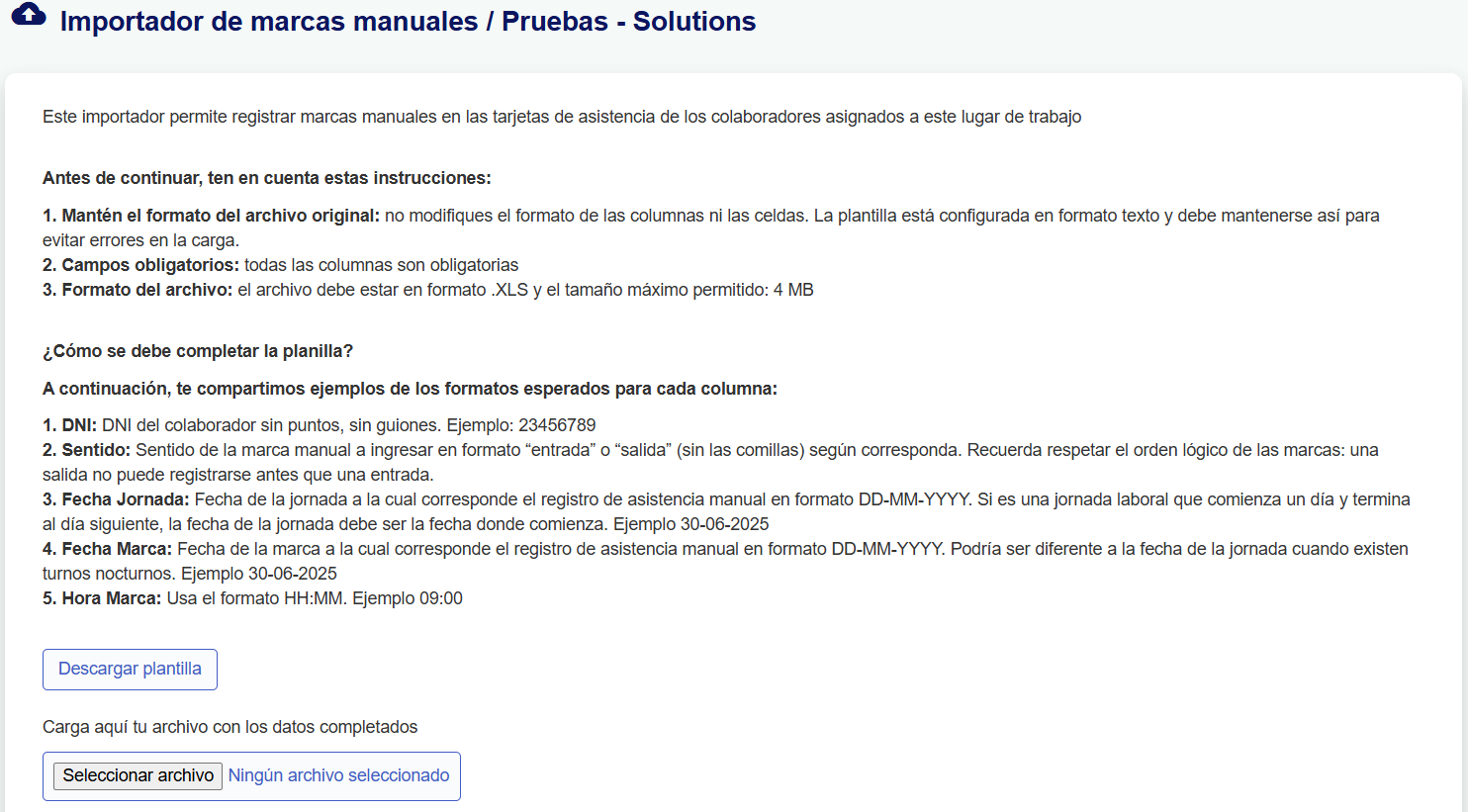 En la pantalla "Agregar marcaciones," encontrarás las instrucciones sobre el formato que debes utilizar para completar la plantilla de importación.