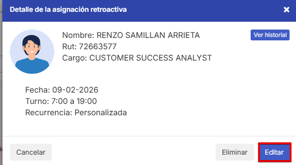 Para conocer el proceso masivo para el proceso de modificación de turnos retroactivos puedes revisar el siguiente artículo.