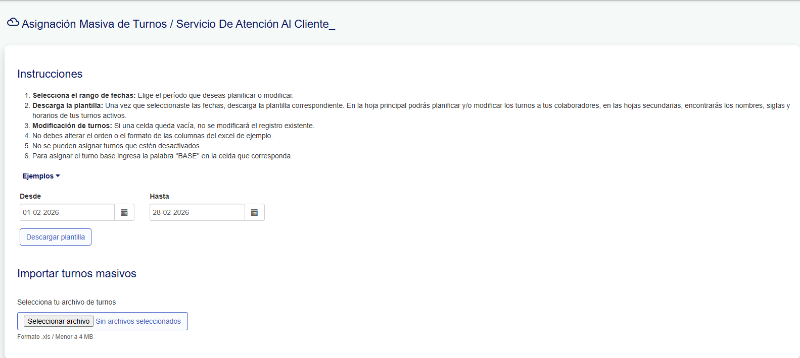 Presta atención a las indicaciones de la página de importación masiva de turnos.