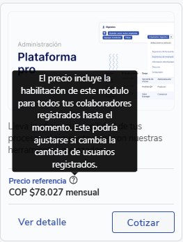 El precio referencial se calcula en base al número de colaboradores activos en tu plataforma. Es el valor total mensual de la solución y siempre debe ser confirmado por el equipo comercial.