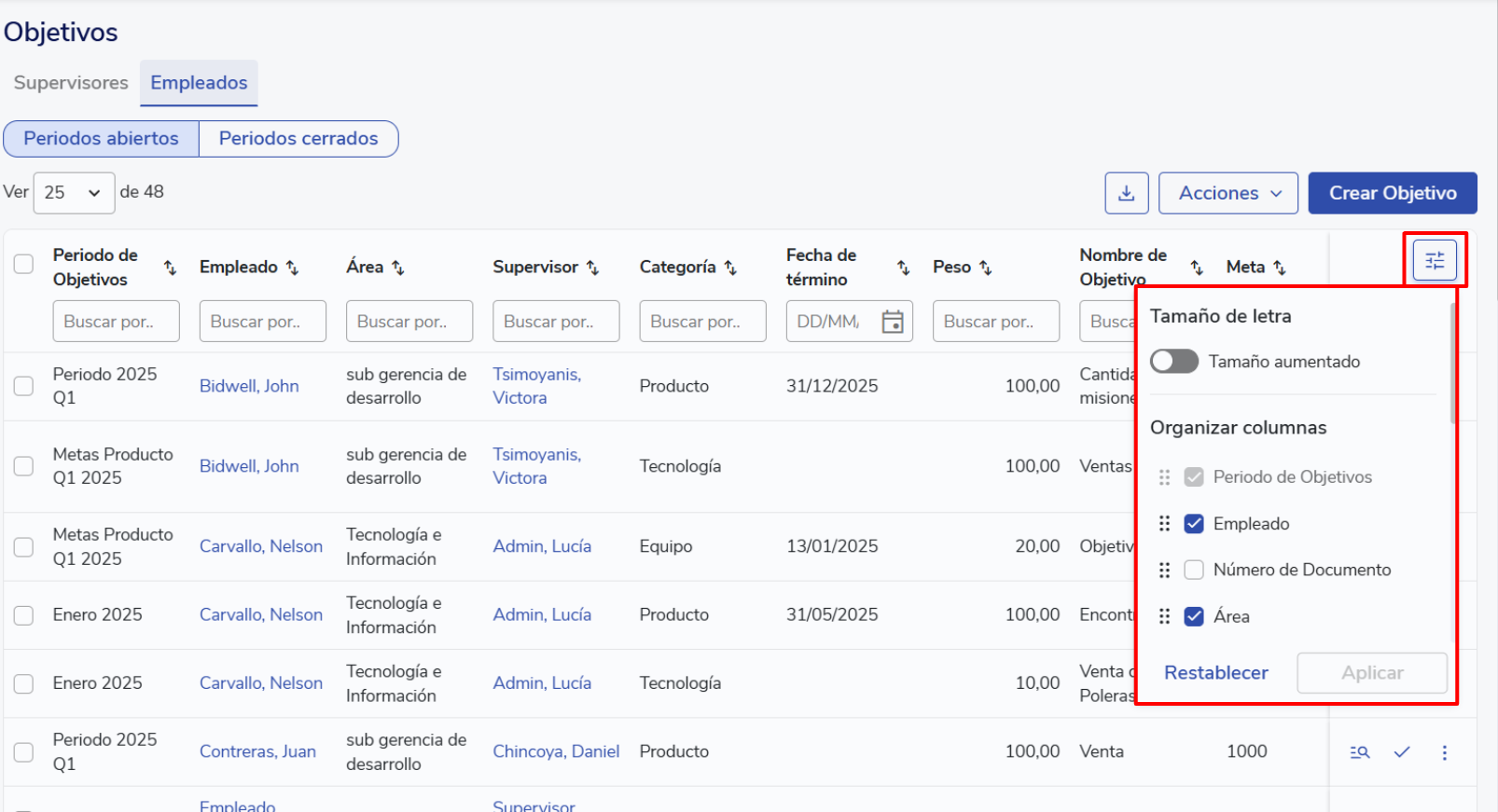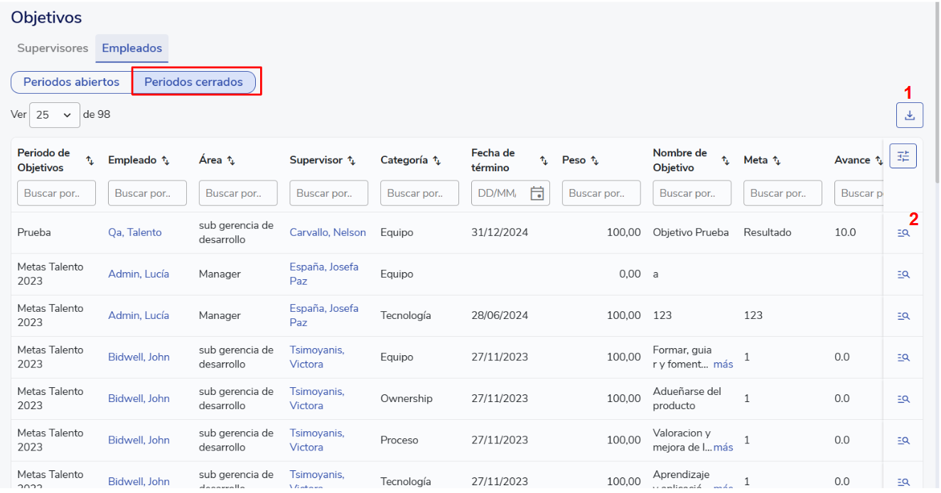 En esta pestaña se muestran todos los objetivos registrados en la plataforma para cada empleado, junto con la información detallada de cada uno, para un conjunto de periodos.