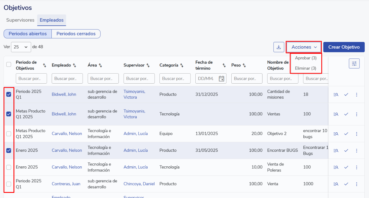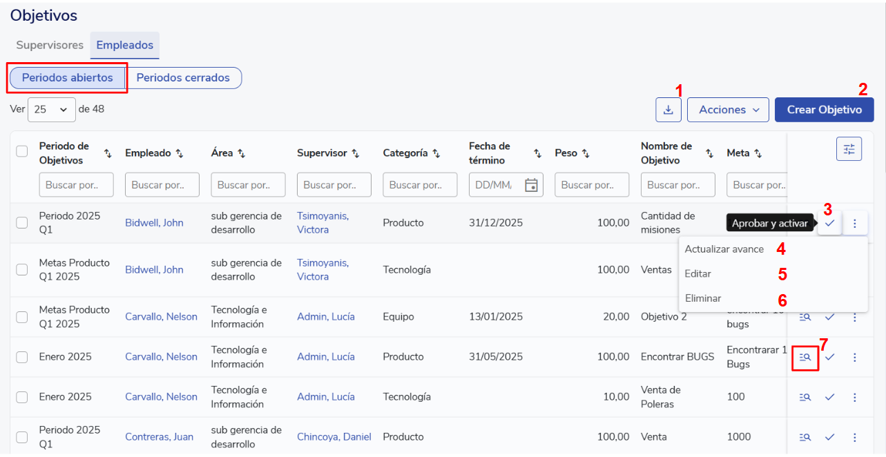 - En la pestaña de “Periodos abiertos” podrás realizar acciones como: ver detalle, aprobar, actualizar avance, editar y eliminar. También, podrás crear nuevos objetivos. Las acciones de aprobar y eliminar también se pueden realizar de forma masiva desde el botón “Acciones” y seleccionando los objetivos que requieras.
