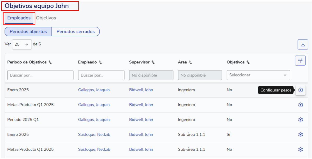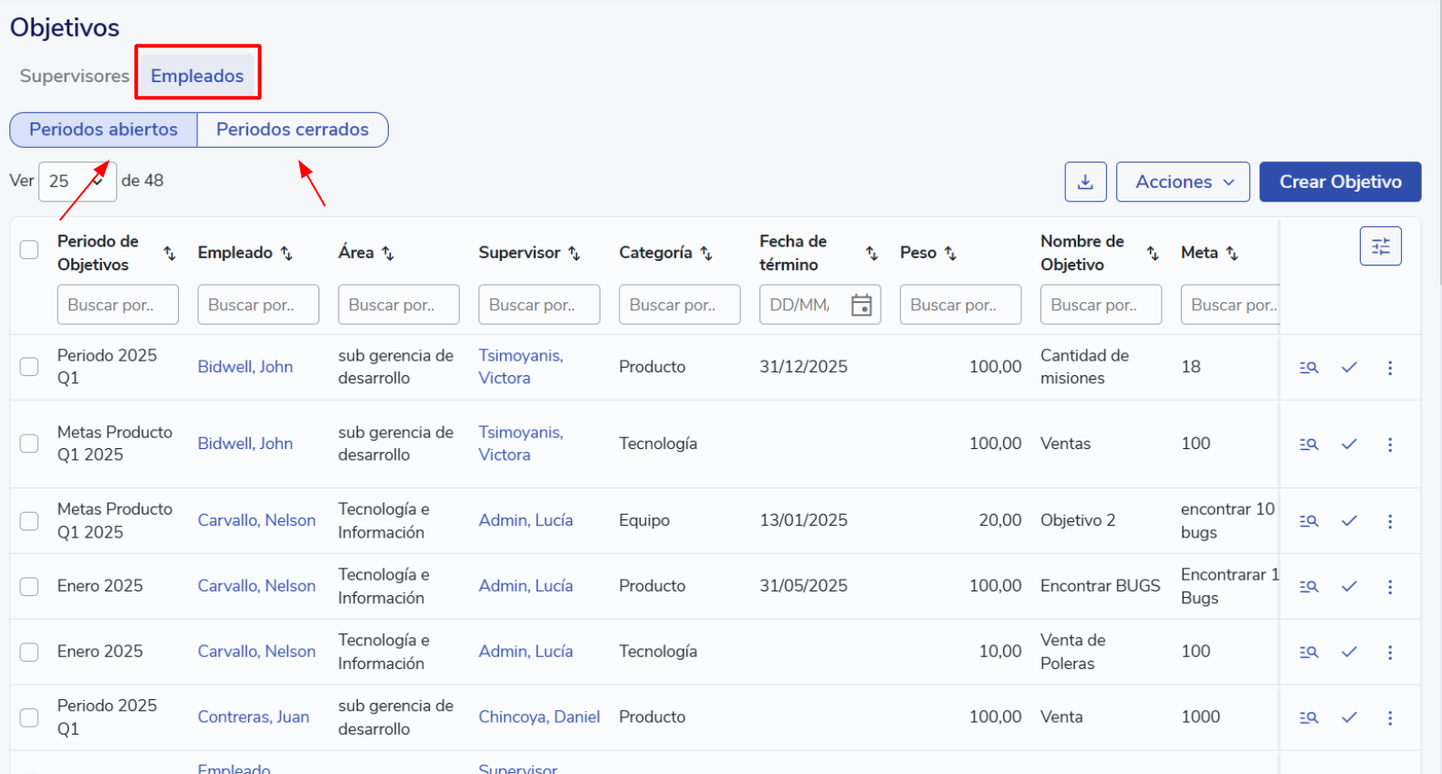 - Empleados: muestra todos los colaboradores que forman parte del equipo del supervisor, sin importar si tienen objetivos o no, para cada periodo.