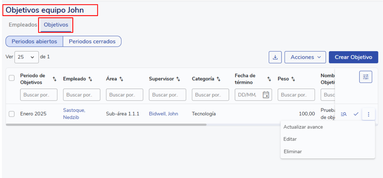 En la vista de “Periodos abiertos” puedes realizar distintas acciones para los objetivos: