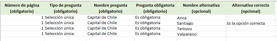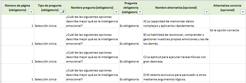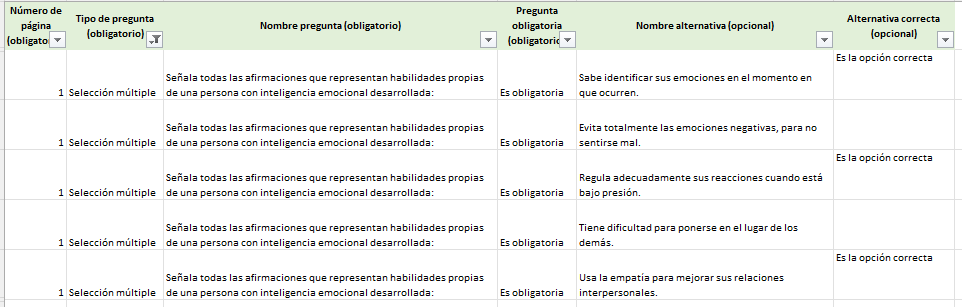 - Cada alternativa ocupa una fila con el mismo enunciado de pregunta.